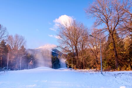 Snow cannons spray artificial snow crystals. Production of artificial snow. Cars make snow. snow guns.