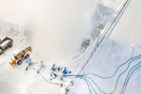 Snow blowing machines or snow cannons making snow