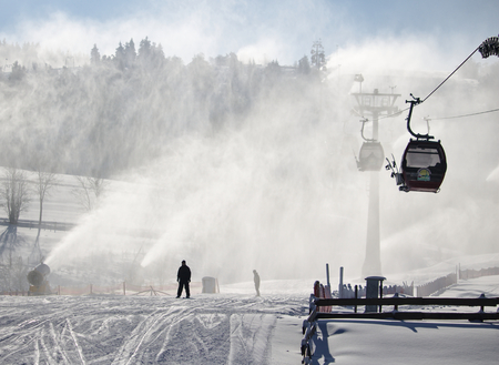 Willingen, Germany - February 7th, 2018 - Ski run with gondola lift and snow cannon shooting clouds of powdery snow