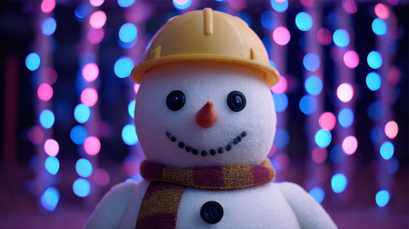 A delightful snowman character dons a yellow construction helmet against a vibrant bokeh backdrop. This whimsical scene captures the spirit of winter festivities and creativity.