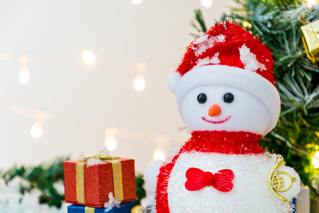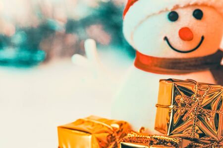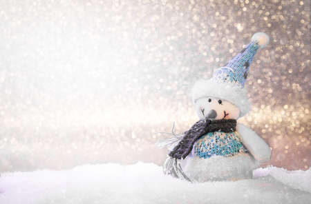 Christmas winter background with snowman and blurred bokeh. Merry christmas and happy new year greeting card with space for text.