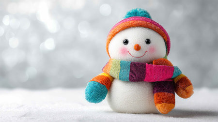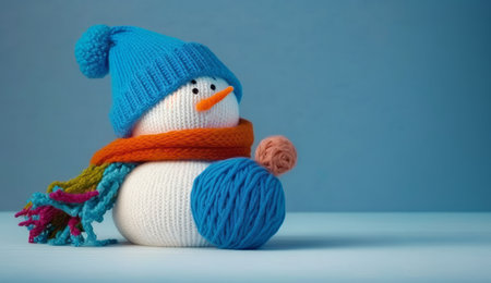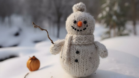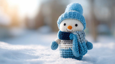 Charming knitted snowman with blue scarf and hat stands in soft snow, embodying winter's magic. Perfect for holiday themes and seasonal decorations.