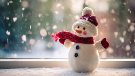 A cheerful snowman stands by a frosty window surrounded by soft snowflakes capturing the warmth and joy of the holiday season.