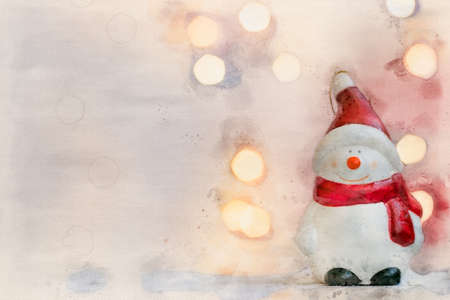Watercolor illustration of small snow man figurine; watercolor Christmas background with copy space