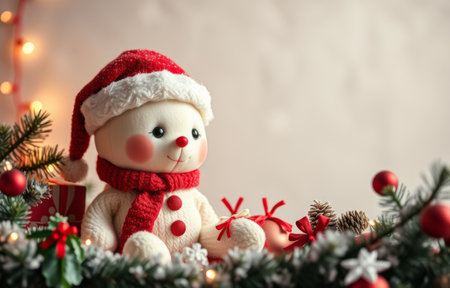 Knitted snowman red hat red scarf winter decoration pine branch festive cozy cold weather