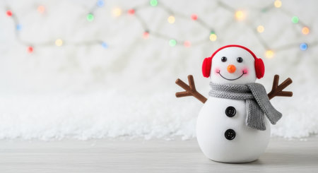 A charming snowman with a carrot nose, button eyes, and rosy cheeks stands in the snow. He wears red ear muffs and a gray scarf. Colorful blurred lights create a festive backdrop.