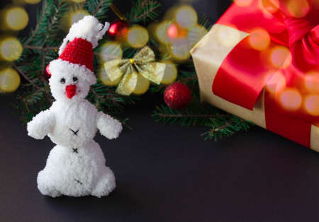 Funny felt snowman with a gift on the background of fir branches with lights of garland on the snow on a festive day. Christmas and New Year concept