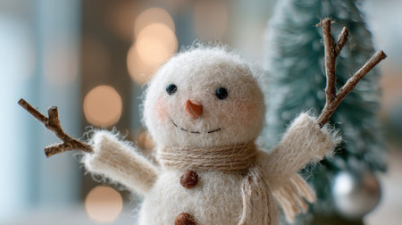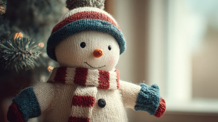 Cozy handmade snowman figurine with scarf on table by window, soft morning light, charming indoor Christmas holiday decoration concept
