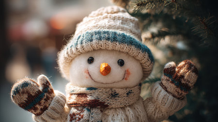 A delightful snowman decoration wearing a bright red scarf, positioned next to a frosted Christmas tree, creates a warm and festive atmosphere perfect for the holiday season.