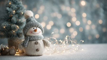 Closeup toy cute snowman in hat and scarf with warm garland lights on bokeh background. Christmas banner.