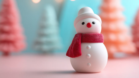 A delightful snowman figurine with a red scarf stands in front of soft pastel Christmas trees. This cheerful scene adds a whimsical touch to holiday decorations.