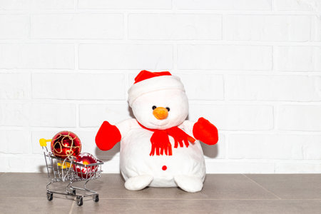 Snowman toy with shopping cart with Christmas balls on white brick wall background. New Year and Christmas.