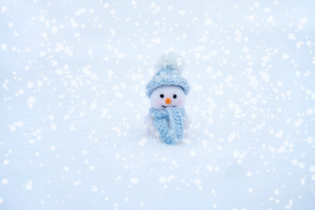 Cute toy snowman in a blue hat and scarf on a snowy background. Christmas and New Year greeting card. winter concept. copyspace.