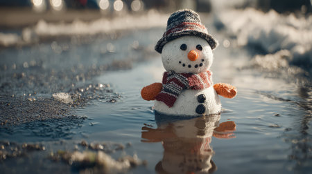 Melting Snowman in Puddle Reflecting Sunset Sky. Generative AI