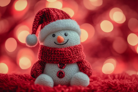 A charming snowman in a red hat and scarf, surrounded by glistening winter lights.