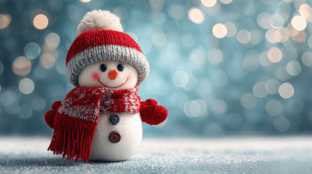 This charming snowman stands proudly with a warm hat and scarf, capturing the essence of winter joy amid a beautifully blurred festive background. Perfect for holidays.