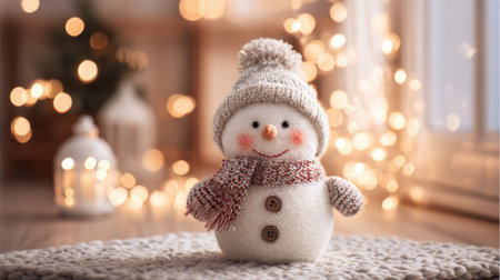 A charming snowman stands on a soft rug in a cozy room. It wears a knitted hat and a scarf with warm lights glowing softly in the background creating a festive atmosphere.
