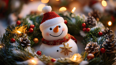 Cute snowman smiling joyfully, sitting near holiday wreath decorated with pinecones, berries, and golden stars, creating festive vibes