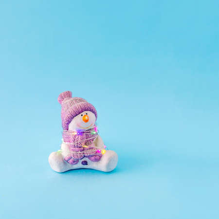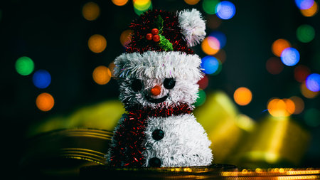 Toy cute snowman with garland lights on colorful bokeh background close-up.