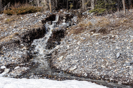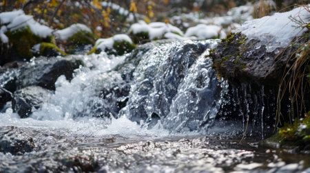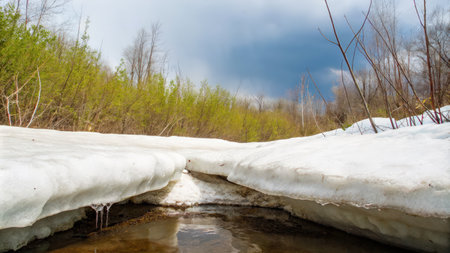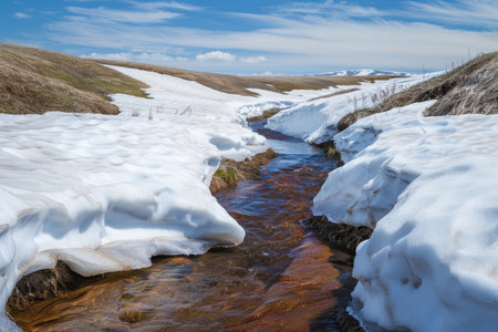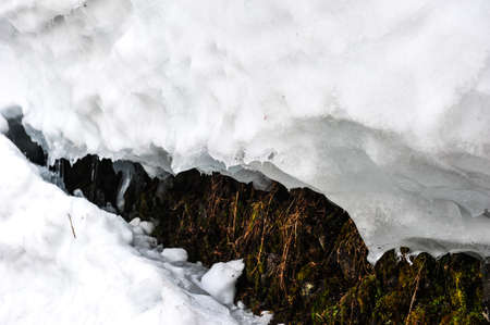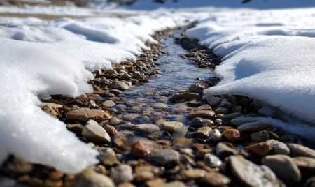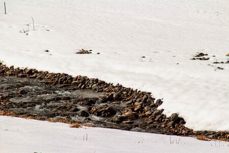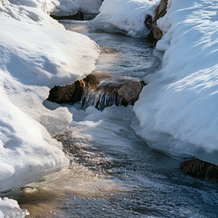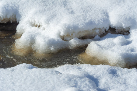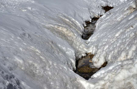 Spring Stream Flowing Through Icy Snowbanks, Showing the Contrast Between Frozen and Moving Water, a Natural Scene Suitable for Winter and spring, Nature, and Seasonal Themes