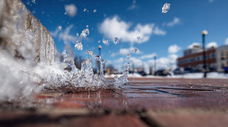 Water splashes hit the ground in a central area during bright daylight with clouds visible in the sky. The scene shows dynamic movement.