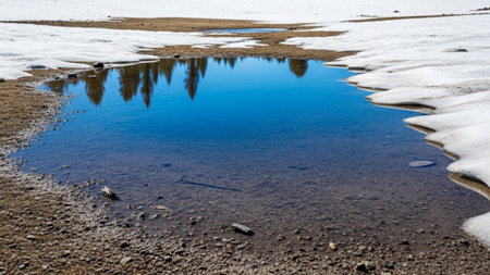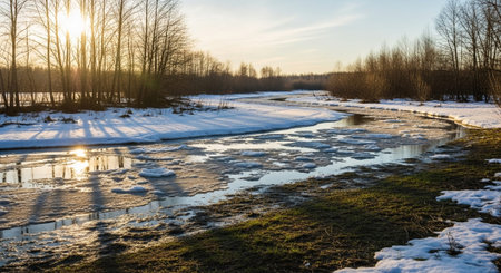 AI generated image of meltwater flooding low-lying land with rippling water over grass and remnants of snow. The scene is bathed in soft natural light, capturing the essence of early spring.