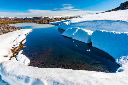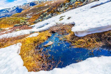 Beautiful Storebottane river by the vavatn lake with snow in the summer landscape in Hemsedal Norway.