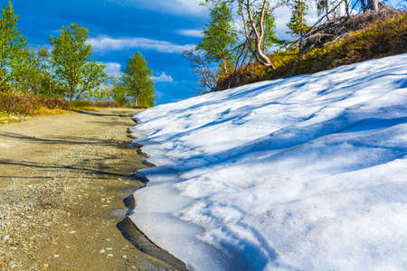 Melting snow on the road street on top of the Hydnefossen waterfall and Veslehødn Veslehorn mountain in Hemsedal Norway.