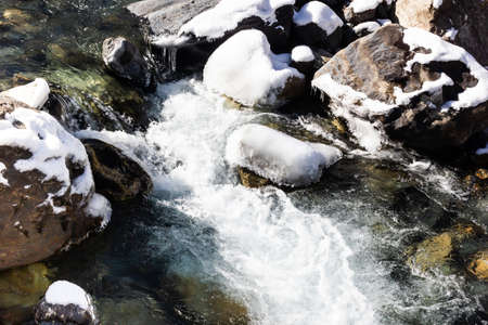 Selective focus river flowing in the mountains with frozen snow