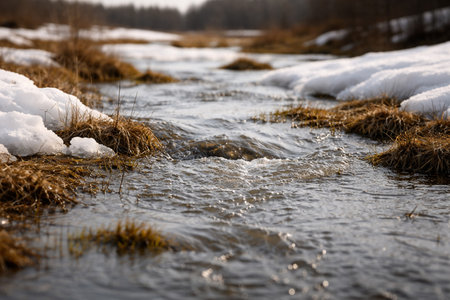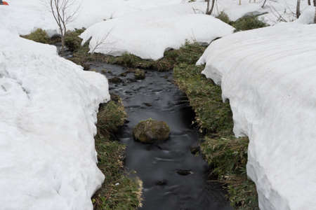 Spring stream, melting snow and the first shoots of grass. Spring equinox