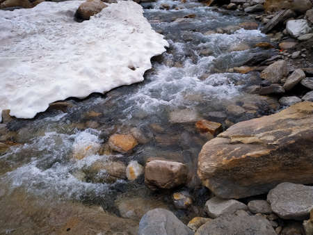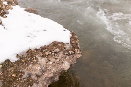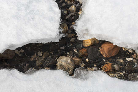 Ice on the river, stream froze. cold season. mountain stream stones. Thaw spring snow. Ice started to break, nature silence