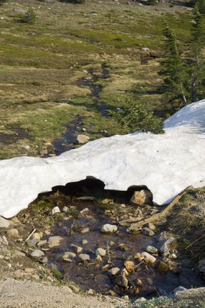 A small snow bridge over an alpine stream in summer at Lassen Volcanic National Park