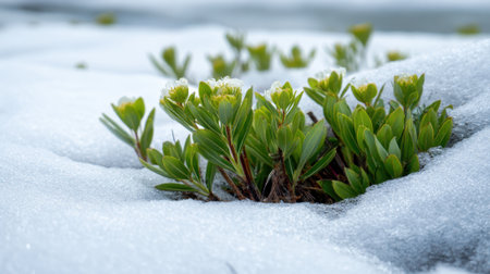 Bright green plants push through patches of melting snow as spring begins, signaling the end of winter. This scene showcases resilience in nature's cycle.