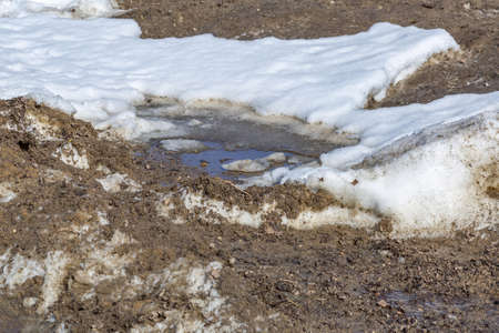 Ice and snow in puddles in spring or autumn time. Thaw after winter in nature