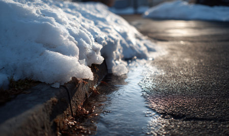 Close-up of melting ice chunks on dark asphalt road with concrete curb