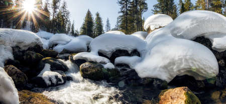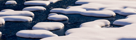 Mountain river with winter white snowy landscape. Winter, cold or Christmas landscape. Beautiful stream with flowing water, panoramic view.