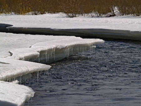 Melting ice on the river in the forest, white snow on the river banks, spring