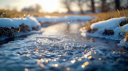 A tranquil winter scene captures a flowing stream surrounded by ice and snow, reflecting soft morning light. Nature's serene beauty shines through.