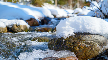 A picturesque winter scene featuring a flowing stream with snow-covered rocks. Sunlight glimmers on the water, creating a serene outdoor atmosphere.