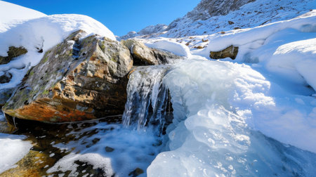 A stunning view of a waterfall cascading over ice-covered rocks in a snowy mountain landscape, perfectly capturing the serene beauty of winter.