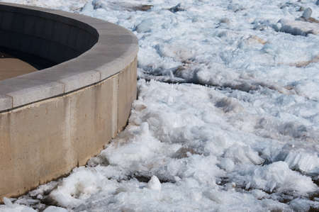 Spring drifting of ice on the river. Part of the city embankment made of concrete. Background from shards of ice. ice texture. Reliable barrier. man and nature concept.