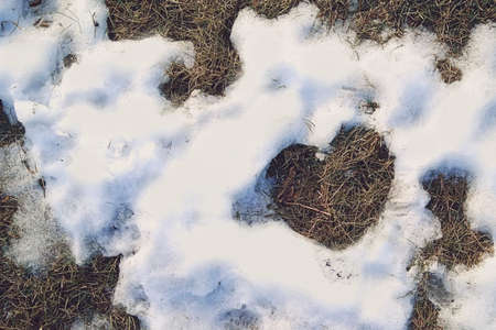 Thawed snow in the shape of a heart, close-up, copy space. Valentine's day