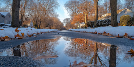 Sunlit Autumn Morning: Snow-Covered Street with Reflections and Falling Leaves