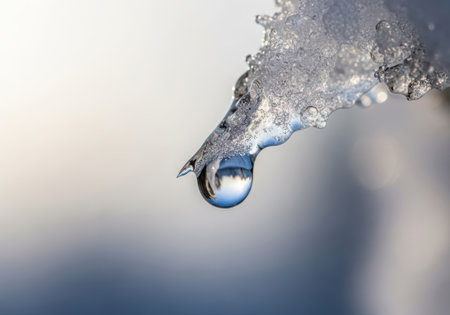 Water droplets fall from melting icicles, creating a peaceful scene against a blurred blue backdrop. This moment captures the transition from winter to spring in nature.