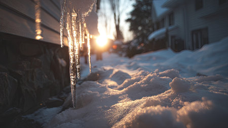 Delicate icicles dangle from a roof as warm sunlight filters through a winter scene, creating a peaceful atmosphere over the snow-covered ground.