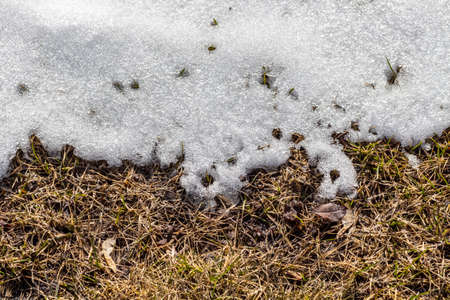 Spring concept. Snow is melting. Earth and dry grass are visible between the snow.