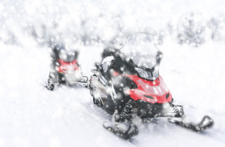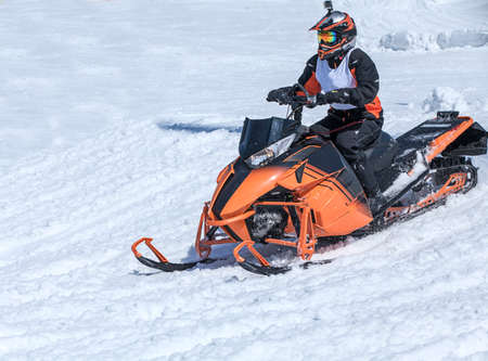 Fun ride on a snowmobile in deep snow. Outdoor sports activities during winter vacation
