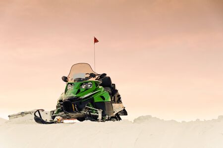 snowmobile in spring afternoon on a mountainside in bright sunshine