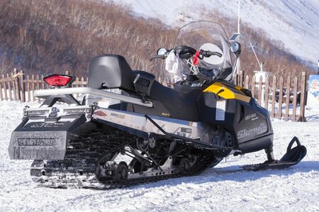 rider moving snowmobile in winter forest in the mountains of Sakhalin Island