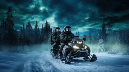 a stunning photo captured during the blue hour showcases the enchanting transformation of the natural landscape. snowmobiles add a touch of adventure to the minimalist scene, while the high-quality, 16k, hd image showcases the beauty in every detail. the photo was taken with a canon 5d, resulting in a transparent and captivating visual experience. ai generated